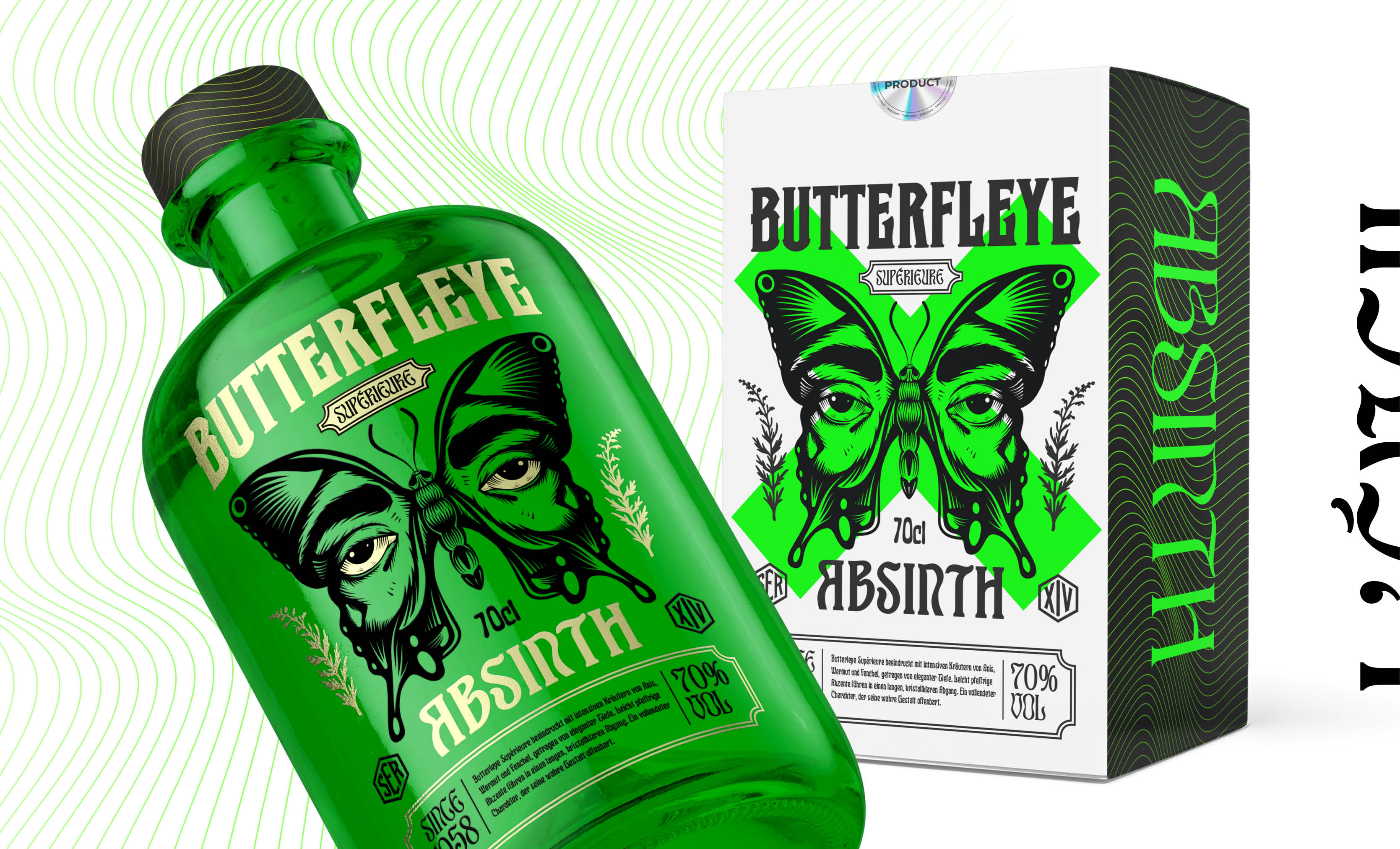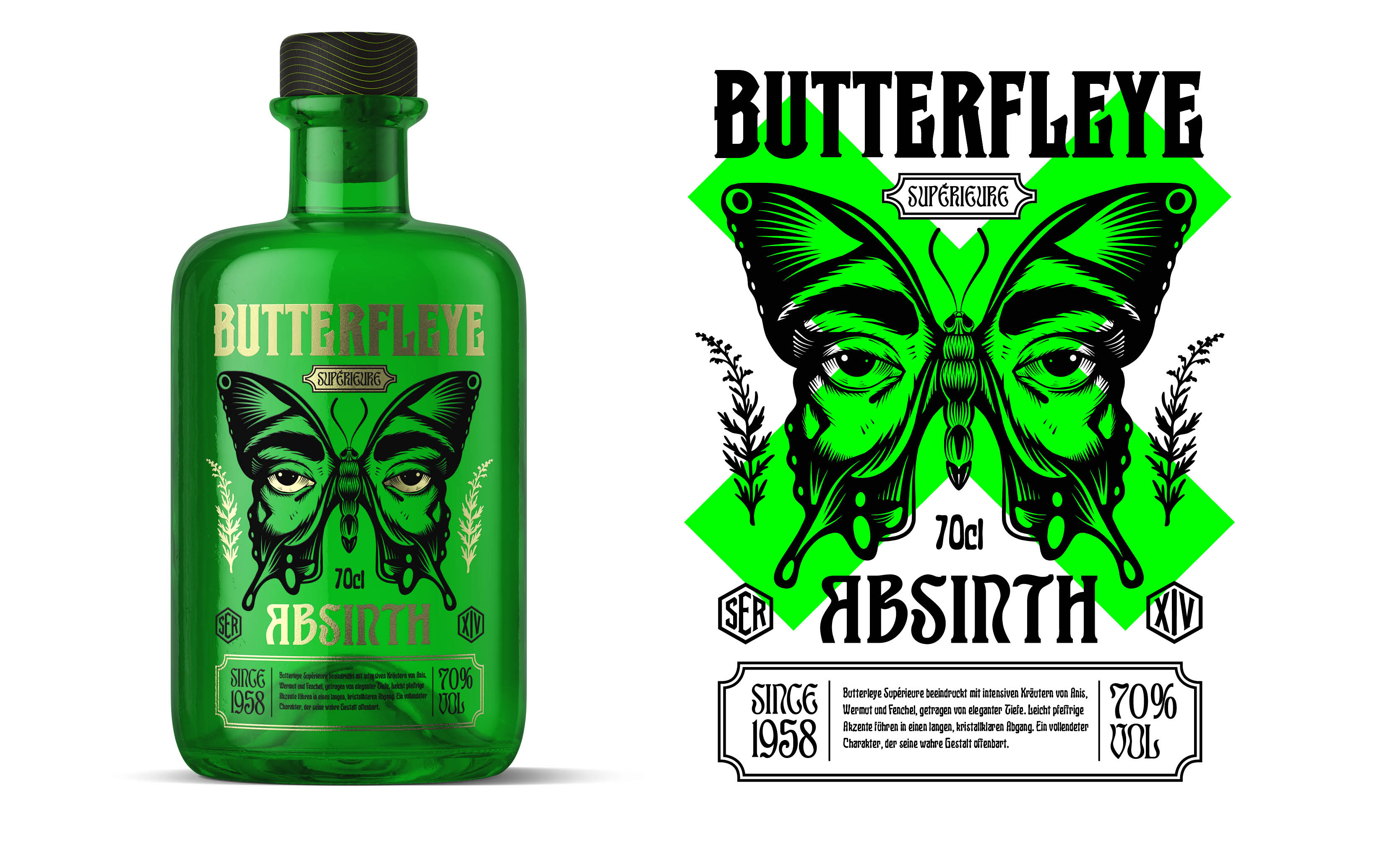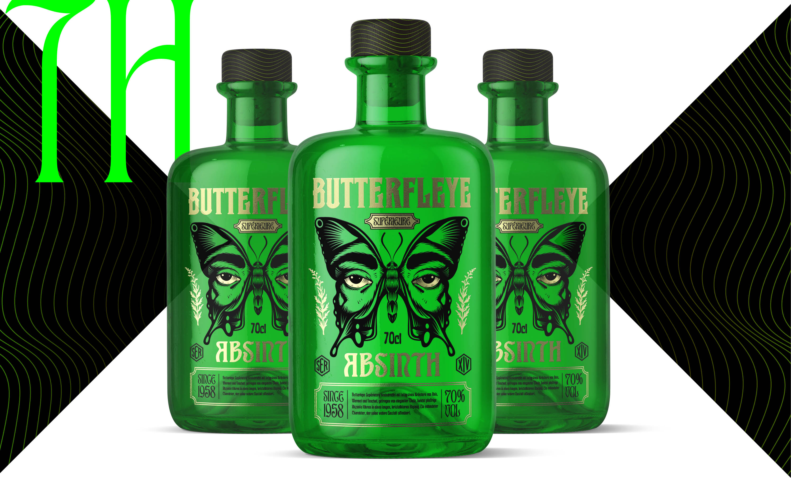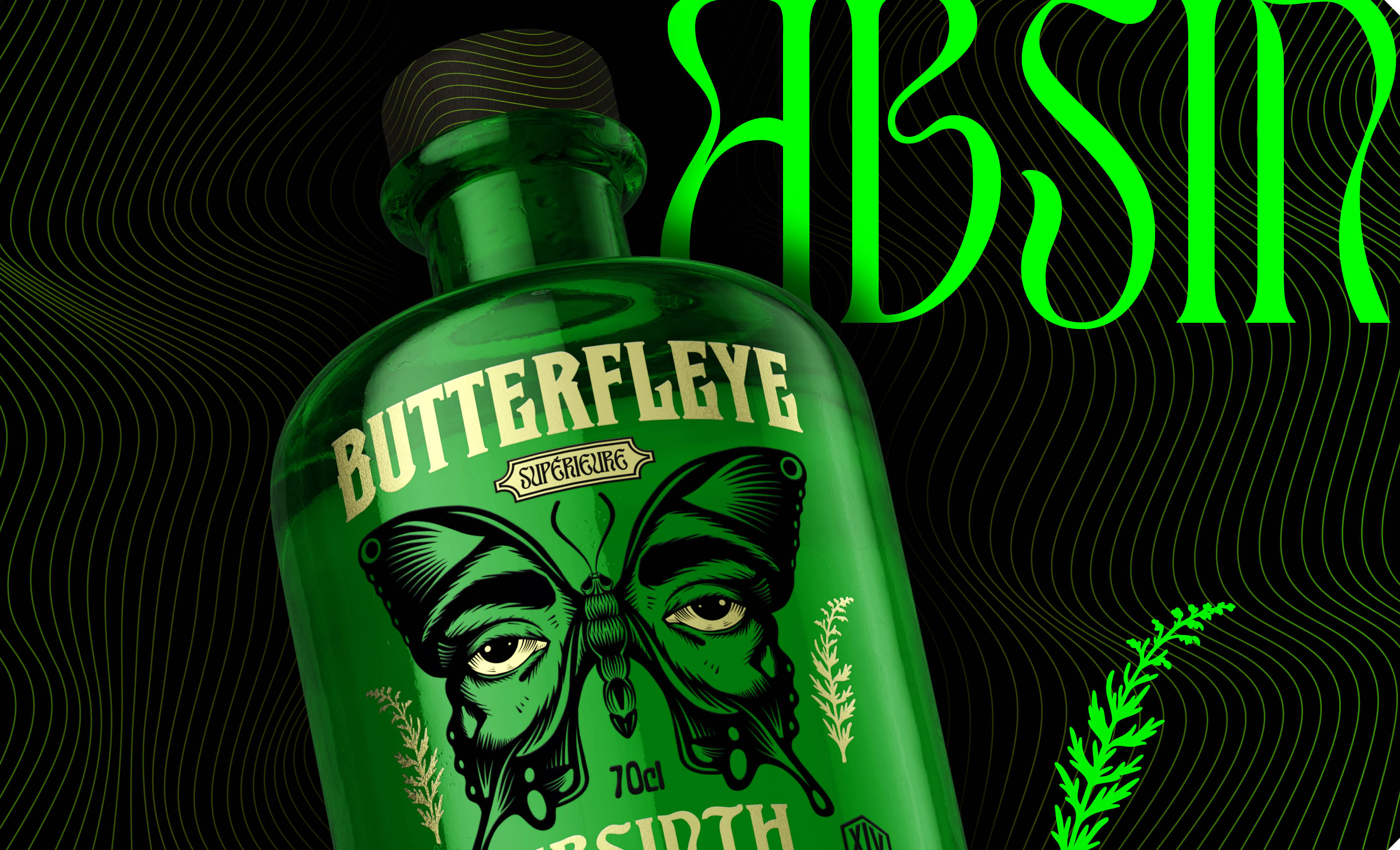 Butterfleye Absinth ist ein Naming- und Labeldesign für eine Schweizer Absinth-Destillation. Die ikonisch grüne Apothekenflasche, trifft auf eine ausdrucksstarke Illustration und plakative Typografie. Butterfleye umfasst drei Botanicals: L’Éveil, Mystique und Superior. Inspiriert von der Metamorphose steht jede Flasche für die geschmackliche Entwicklung – vom Erwachen über die Verwandlung bis hin zur Vollendung. Handwerkskunst, ausgewählte Kräuter und präzise Destillation verleihen diesem Absinth Flügel.