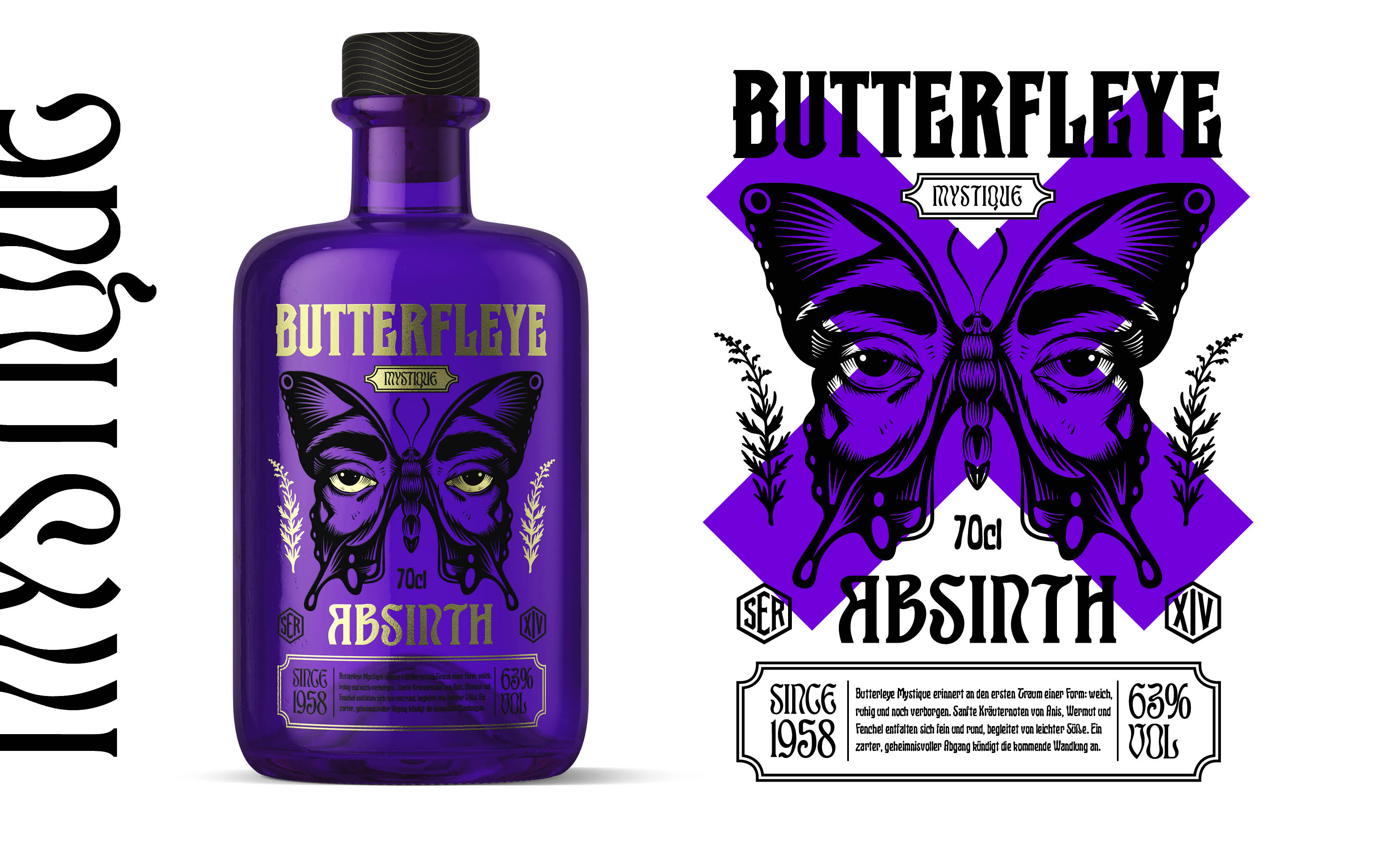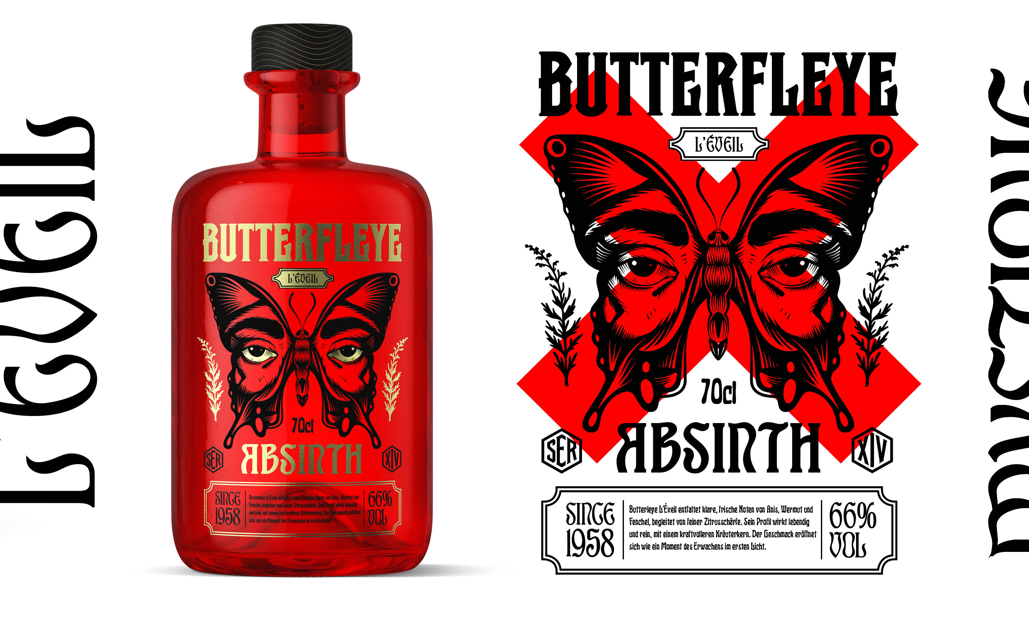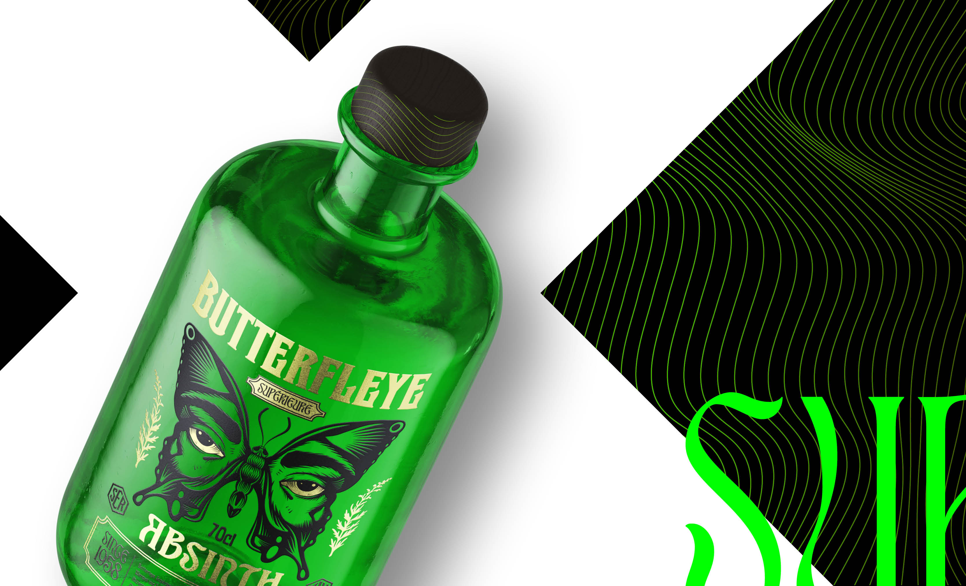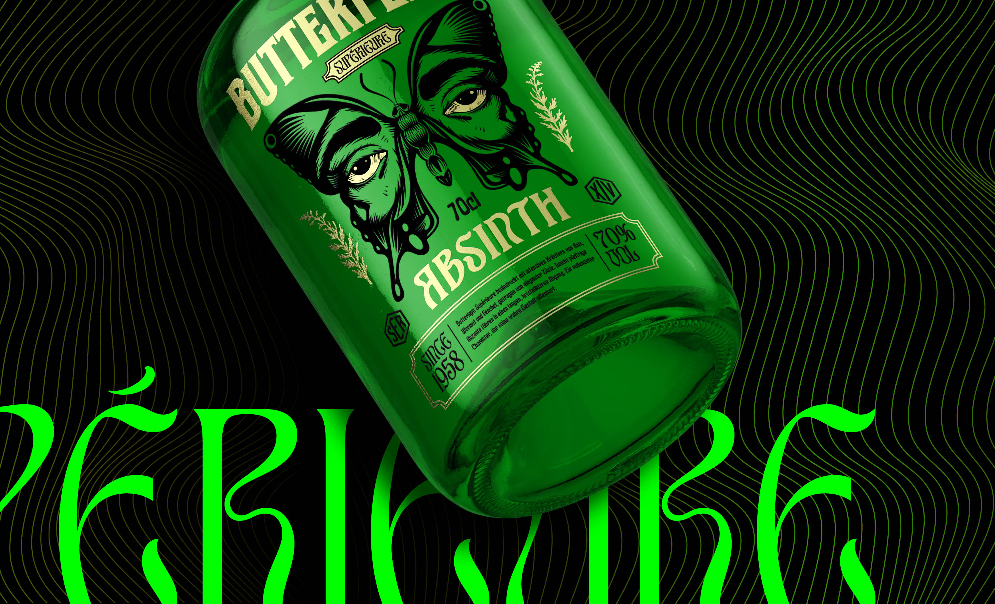 Butterfleye Absinth ist ein Naming- und Labeldesign für eine Schweizer Absinth-Destillation. Die ikonisch grüne Apothekenflasche, trifft auf eine ausdrucksstarke Illustration und plakative Typografie. Butterfleye umfasst drei Botanicals: L’Éveil, Mystique und Superior. Inspiriert von der Metamorphose steht jede Flasche für die geschmackliche Entwicklung – vom Erwachen über die Verwandlung bis hin zur Vollendung. Handwerkskunst, ausgewählte Kräuter und präzise Destillation verleihen diesem Absinth Flügel.